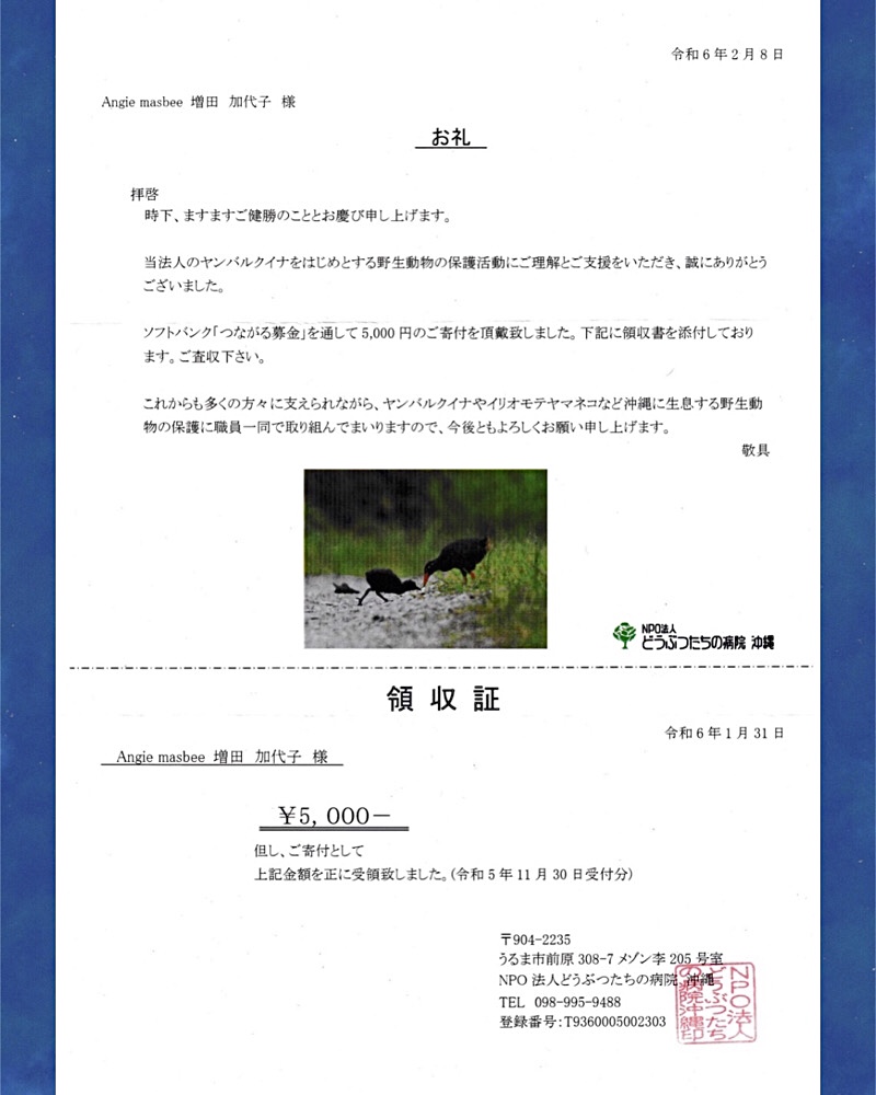 2024-02-25 / 最終更新日時 : 2024-04-09 angie masbee 寄付のご報告 寄付のご報告 2 Save the Redlistの活動にご賛同いただきヤンバルクイナTシャツをご購入いただきましたお客様に感謝を申し上げるとともに寄付のご報告を申し上げます。 2023年11月末分の寄付の受領証です。 2023年は総額で70,000円の寄付につながりました。(2023年の残りの12月分の受領証も受け取り次第、更新いたします) 皆様のご支援、ご協力のおかげです。心より感謝申し上げます。 Follow me! FacebookXHatenaPocketCopy コメントを残す コメントをキャンセルメールアドレスが公開されることはありません。 ※ が付いている欄は必須項目ですコメント ※ 名前 ※ メール ※ サイト 次回のコメントで使用するためブラウザーに自分の名前、メールアドレス、サイトを保存する。