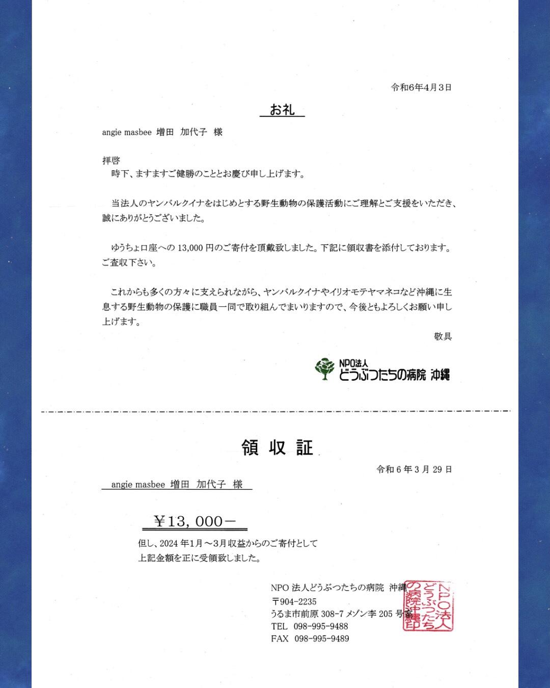 2024年1〜3月分の寄付の受領証です。
